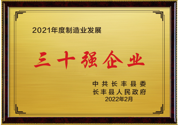 榮譽名稱:2021年度長豐縣制造業(yè)發(fā)展30強企業(yè)